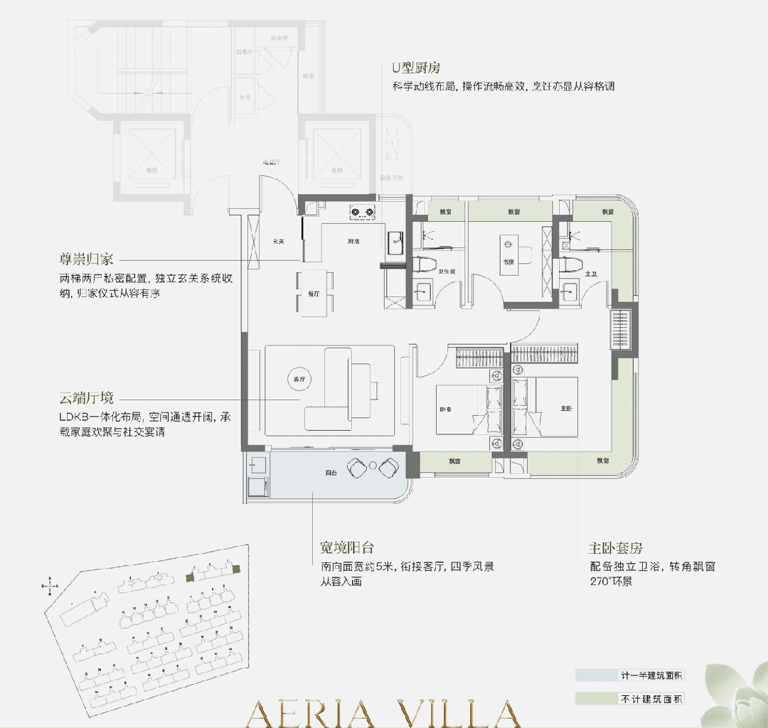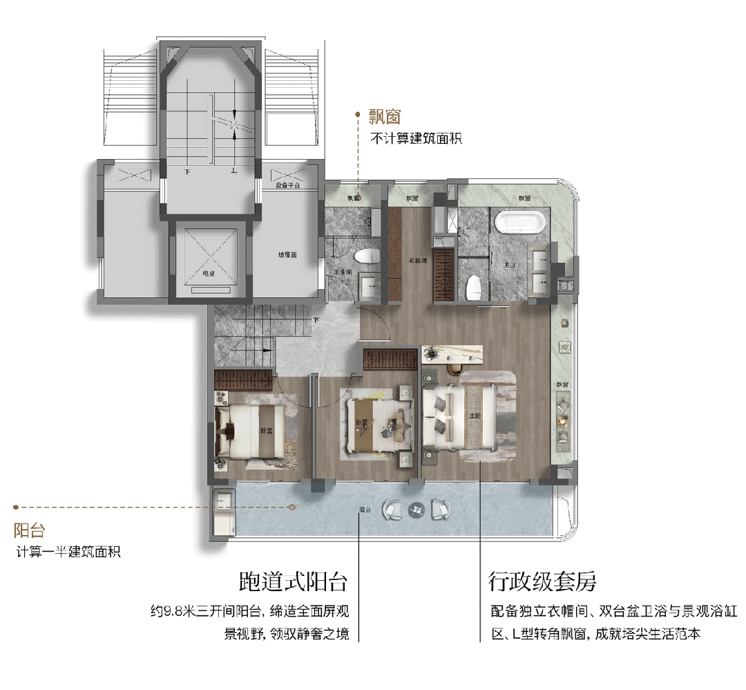 ,装备270°环幕视野、独立卫浴及衣帽间,其豪华体验堪比顶级栈房套房。主卫亦享有270度转角飘窗。