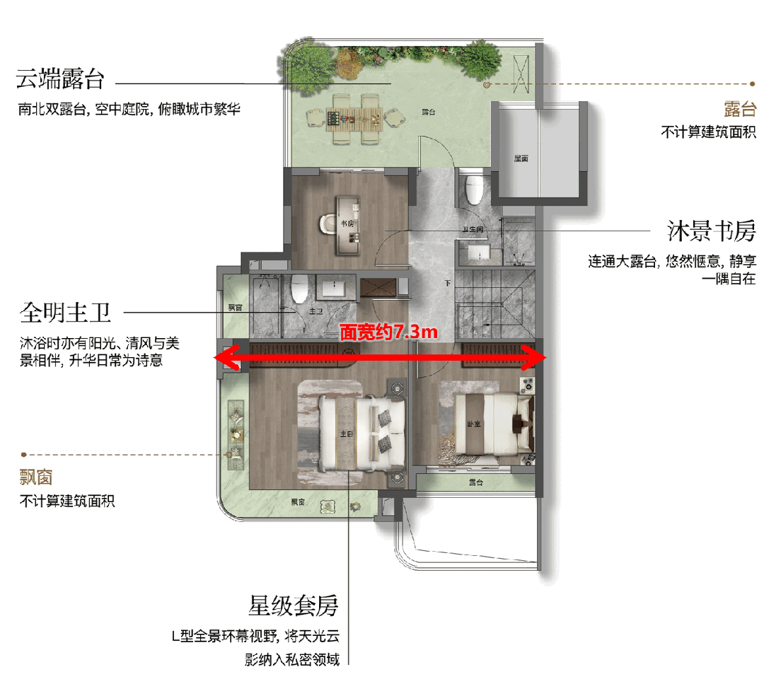 装备独立卫浴与衣帽间,营制出栈房式寓居体验。最令人赞叹的是南北双天台的摆设,为盆栽园艺、星空茶馆、阅读角落等性子化生涯场景供给了无尽或许。