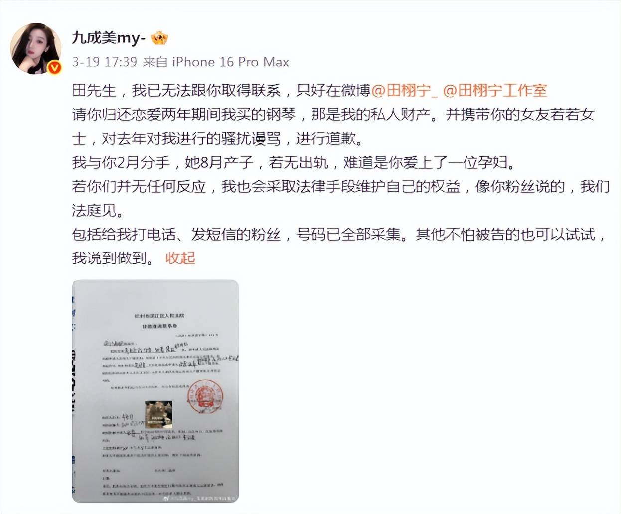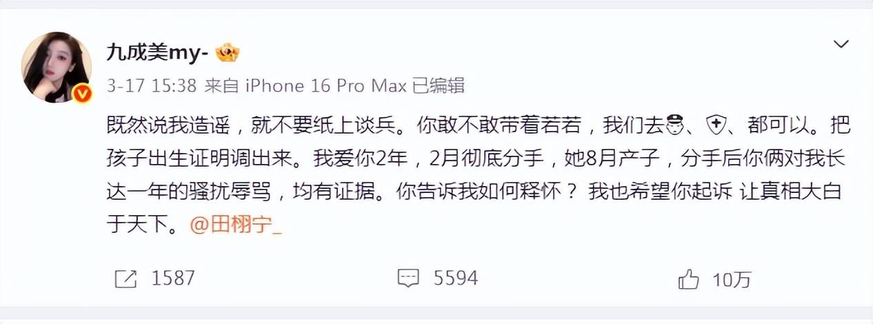 就正在方才,网红圈直接迎来一场大地动 —— 出名网红九成美,正在社交平台公然采布长文,实名举报本人的前男友田栩宁,字字带锤,刹时引爆全网热搜,成了全面吃瓜全体的核心。